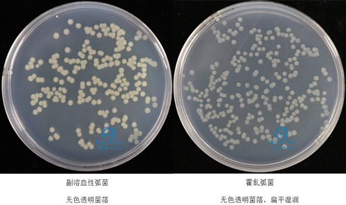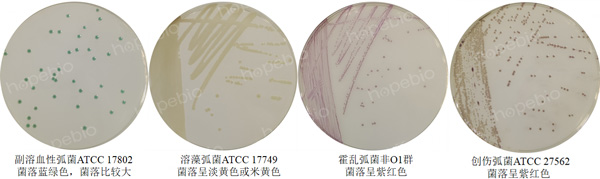 弧菌显色培养基是青岛海博生物公司改良的培养基,用于食品、海产品、病人粪便样品和水产品中副溶血性弧菌的快速检测。副溶血性弧菌显蓝绿色且菌落比较大,霍乱弧菌和创伤弧菌显紫红色,溶藻弧菌显淡黄色或米黄色;其它细菌绝大部分被抑制。