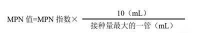 ② 如果接种的水样量不是10mL,1mL和0.1mL,而是较低的或较高的三个浓度的水样量,也可查表求得MPN指数,再经下面的公式换算成每100mL的MPN值。