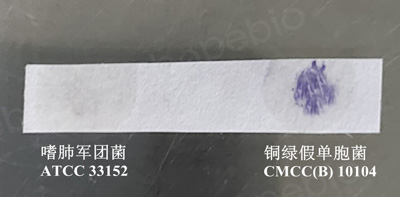 用无菌水将氧化酶试纸浸湿,用玻璃棒或一次性接种针挑取单个菌落涂在试纸上。如果在30 s内出现紫罗兰色或深蓝色为阳性;2 min不变色为阴性。嗜肺军团菌为氧化酶阴性或弱阳性。结果如图2所示。