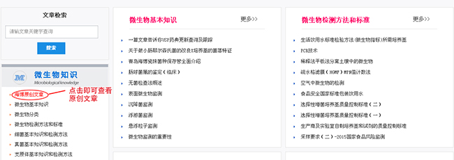 打开页面后,在页面左侧找到“微生物知识”一栏,点击“海博原创文章”即可查看。