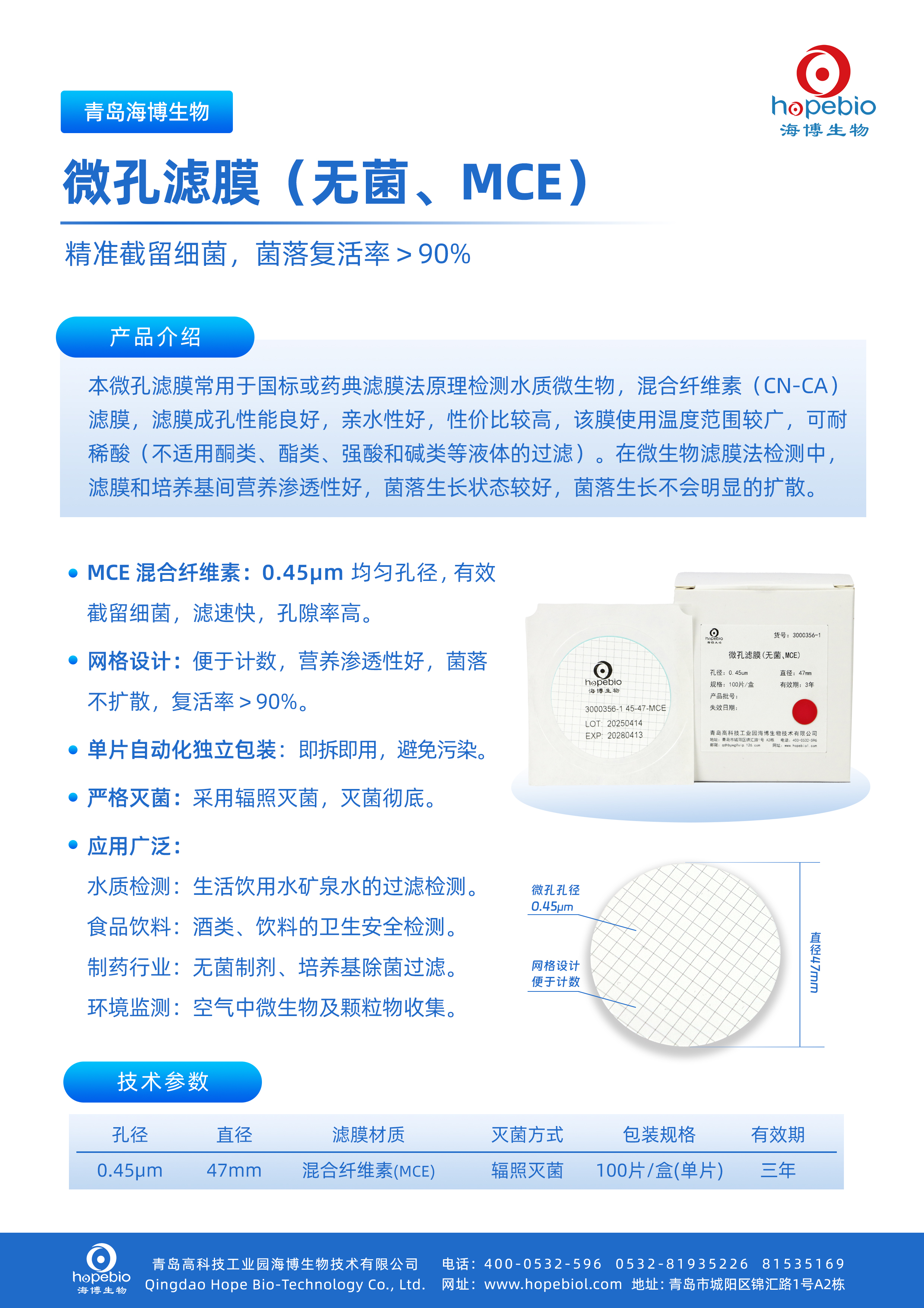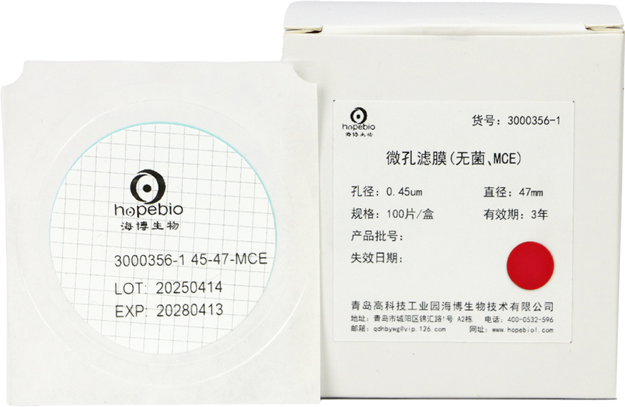 MCE混合纤维素:0.45μm 均匀孔径,有效截留细菌,滤速快,孔隙率高。