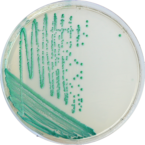 弧菌显色培养基是青岛海博生物公司改良的培养基,用于食品、海产品、病人粪便样品和水产品中副溶血性弧菌的快速检测。副溶血性弧菌显蓝绿色至蓝色,其它弧菌显无色;其它细菌显黄色或无色,且细菌菌落很小。本培养基的特异性高,可以克服TCBS培养基引起的假阴性结果,是一种很理想的快速检测培养基。