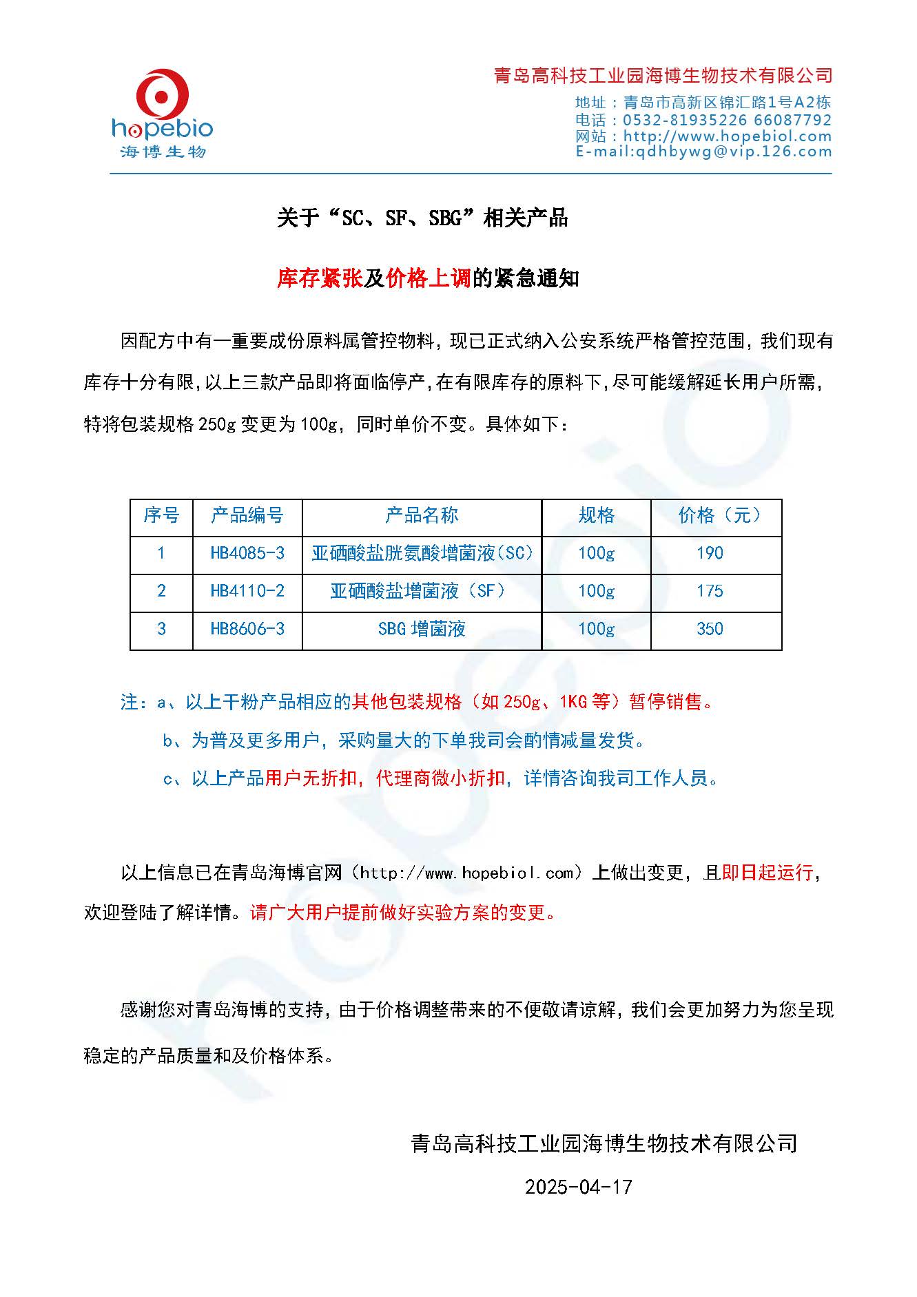 青岛海博生物-关于SC 、SF 、SBG价格上调变更通知