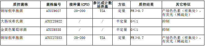 按标签用法制备培养基,接种以下质控菌株,放置36±1℃需氧培养24-48小时。