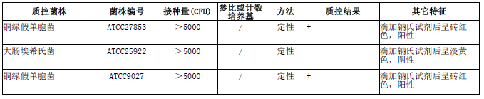 按标签用法制备培养基,接种以下质控菌株,放置36±1℃需氧培养20-24小时。