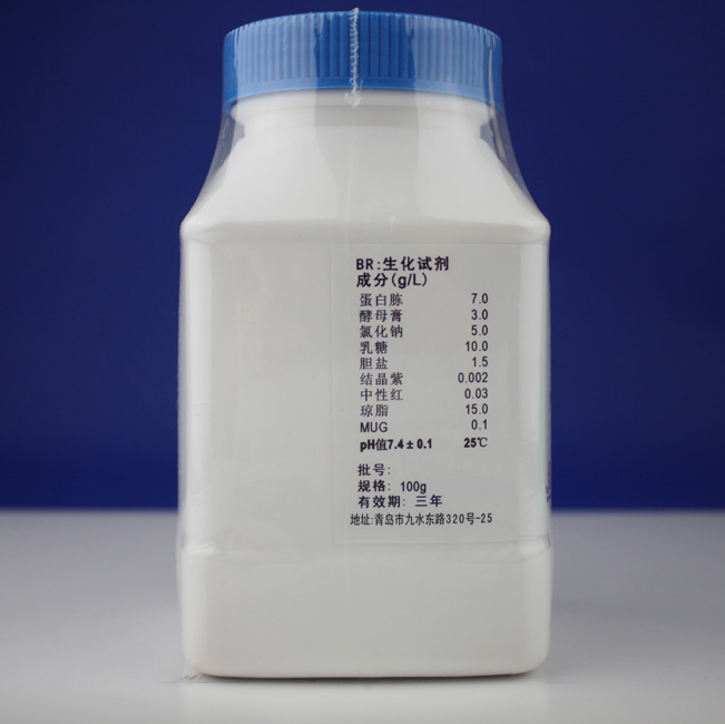 蛋白胨 7.0 酵母膏 3.0 氯化钠 5.0 乳糖 10.0 胆盐 1.5 结晶紫 0.002 中性红 0.03 琼脂 15.0 MUG 0.1 pH值7.4 ± 0.1 25℃
