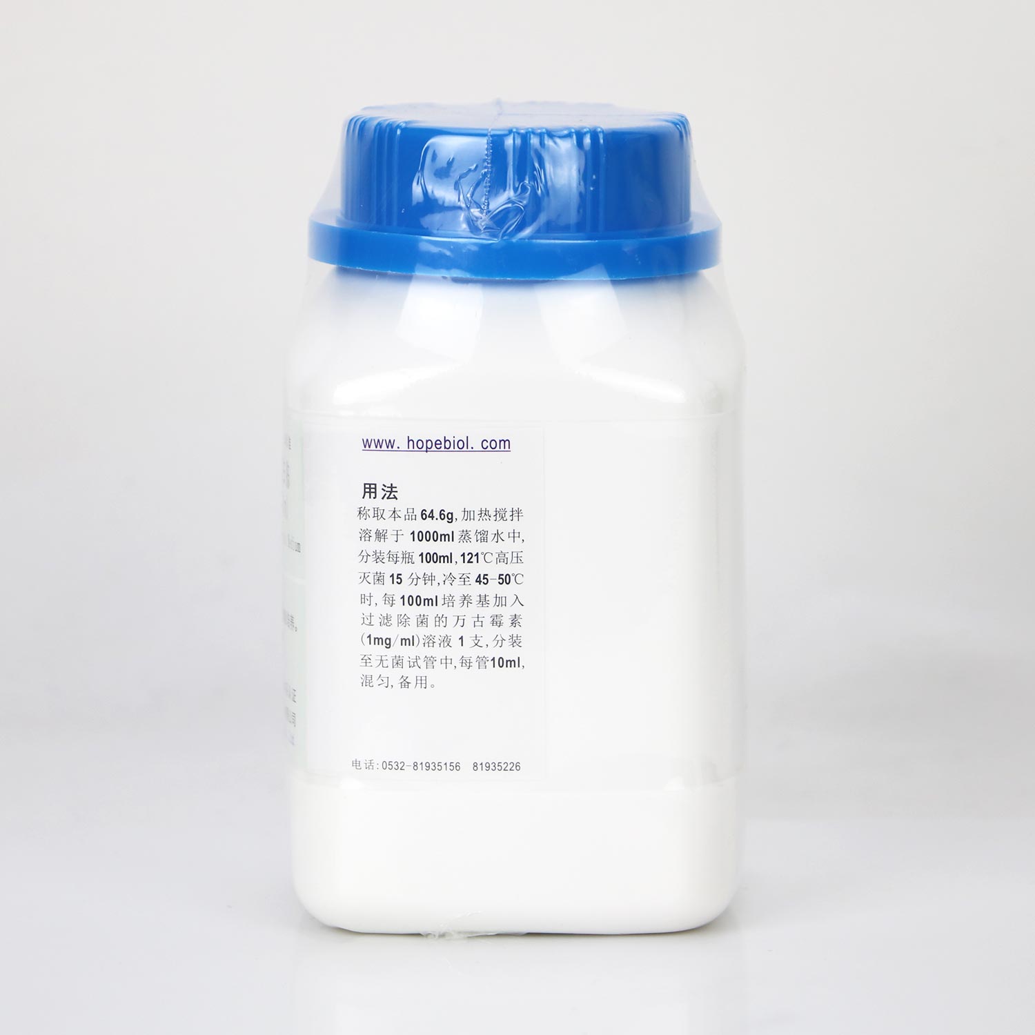 称取本品64.6g,加热搅拌溶解于1000ml蒸馏水中,分装每瓶100ml,121℃高压灭菌15分钟,冷至45-50℃时,加入过滤除菌的万古霉素(1mg/ml)溶液1支,分装至无菌试管中,每管10ml,混匀,备用。