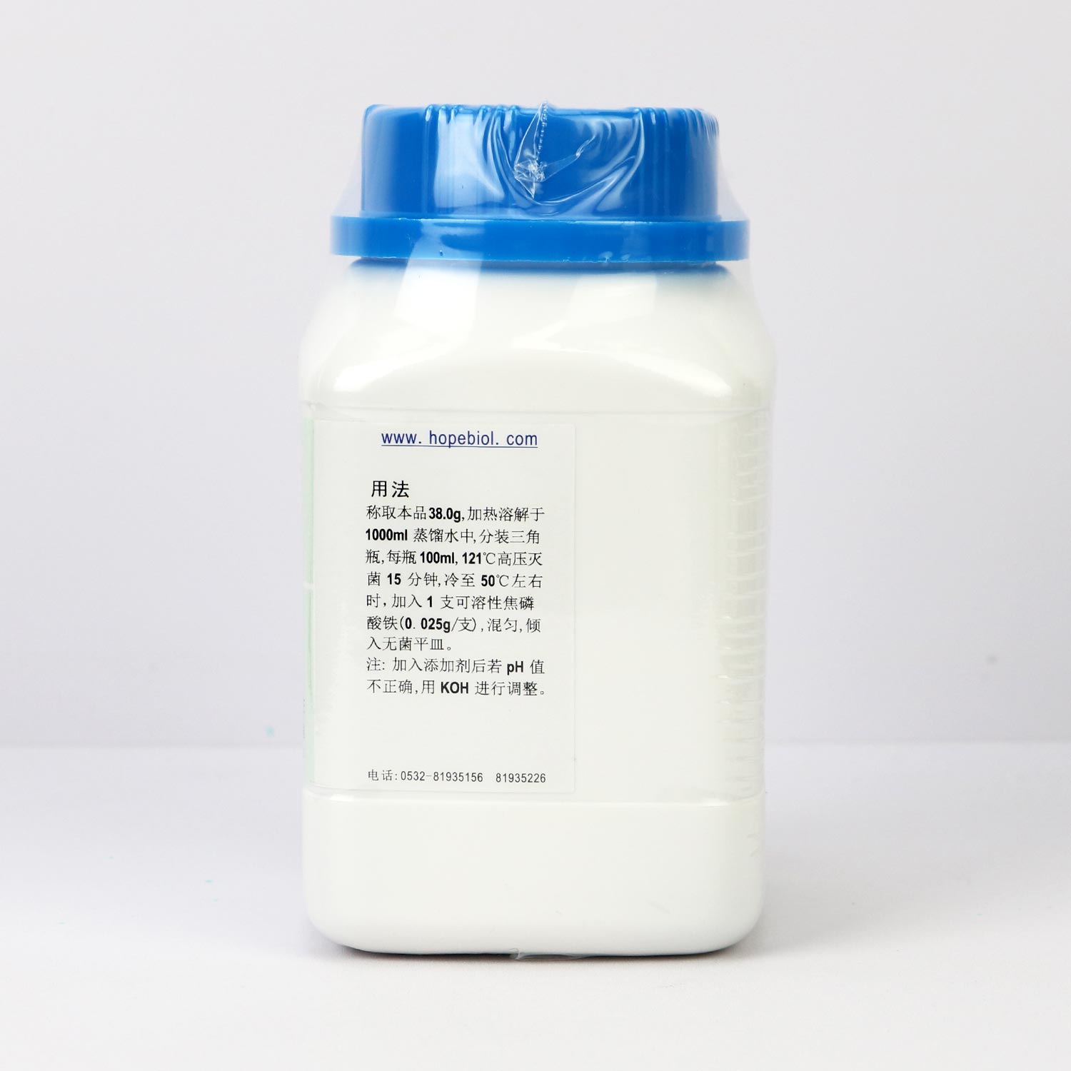 称取本品38.0g,加热溶解于1000ml蒸馏水中,分装三角瓶,每瓶100ml,121℃高压灭菌15分钟,冷至50℃左右时,加入1支可溶性焦磷酸铁(0.025g/支),混匀,倾入无菌平皿。