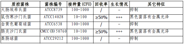按标签用法制备培养基,接种以下质控菌株,放置30-35℃需氧培养24-48小时。