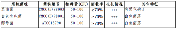 按标签用法制备培养基,接种以下质控菌株,放置23-28℃需氧培养48-72小时。 注:回收率计算时,用SDA琼脂做对照培养基。