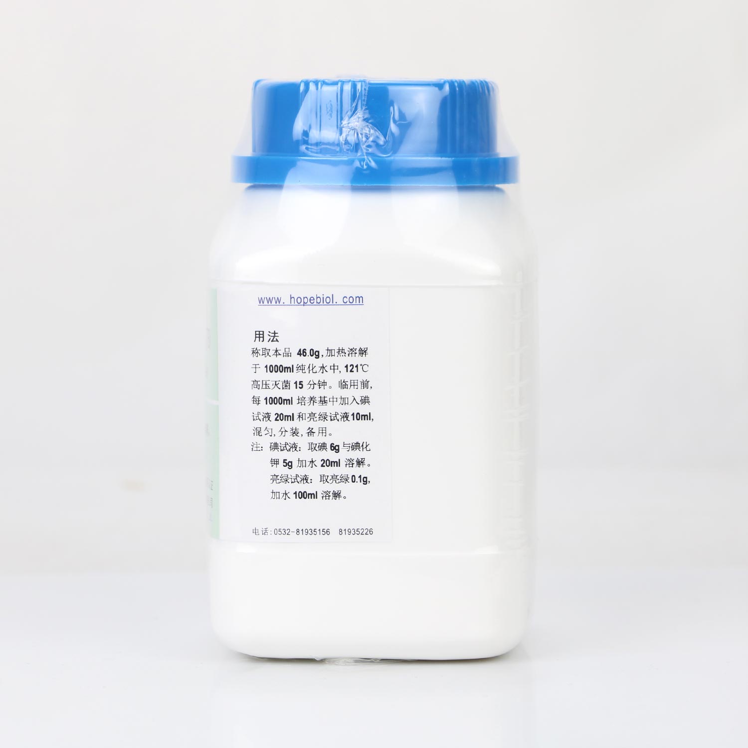 称取本品46.0g,加热溶解于1000ml纯化水中,121℃高压灭菌15分钟。临用前,每1000ml培养基中加入碘试液20ml和亮绿试液10ml,混匀,分装,备用。