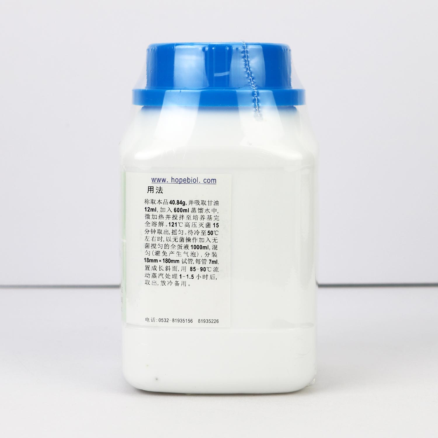 称取本品40.84g,并吸取甘油12ml,加入600ml蒸馏水中,微加热并搅拌至培养基完全溶解。121℃高压灭菌15分钟取出,摇匀。待冷至50℃左右时,以无菌操作加入无菌搅匀的全蛋液1000ml ,混匀(避免产生气泡),分装18*180mm试管,每管约7ml,置成长斜面,用85-90℃流动蒸汽处理1-1.5小时后,取出,放冷备用。