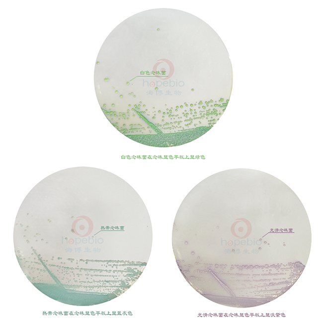 用于弧菌的显色培养,副溶血性弧菌显蓝绿色,霍乱弧菌和创伤弧菌显紫红色,溶藻弧菌显淡黄色或米黄色 |