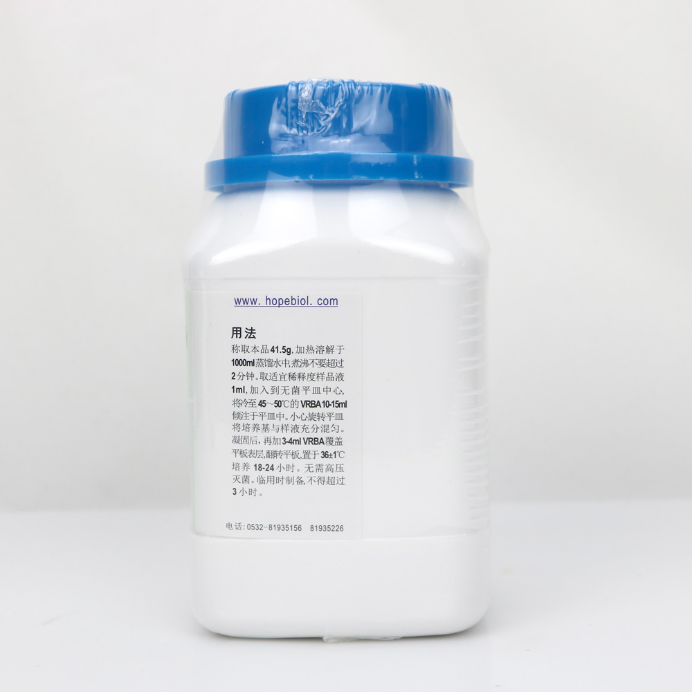称取本品41.5g,加热溶解于1000ml蒸馏水中,煮沸不要超过2分钟。取适宜稀释度样品液1ml,加入到无菌平皿中心,将冷至45-50℃的VRBA 10-15ml倾注于平皿中。小心旋转平皿将培养基与样液充分混匀。凝固后,再加3-4ml VRBA覆盖平板表层,翻转平板,置于36±1℃培养18-24小时。无需高压灭菌。临用时制备,不得超过3小时。