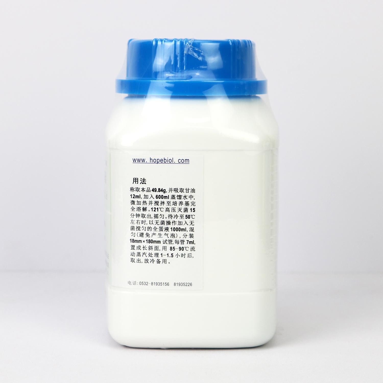 称取本品49.84g,并吸取甘油12ml,加热搅拌溶解于 600ml蒸馏水中,煮沸5-10分钟,121℃高压灭菌15分钟取出。待冷至55℃左右时,以无菌操作加入无菌搅匀的全蛋液1000ml,混匀 ( 避免产生气泡 ),分装18mm×180mm试管,每管7ml,置成长斜面 ,用 85-90℃流动蒸汽 1-1.5小时后,取出,放冷,备用。