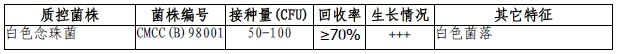 按标签用法制备培养基,接种以下质控菌株,放置23-28℃需氧培养24-48小时。 注:回收率计算时,用SDA琼脂做对照培养基。