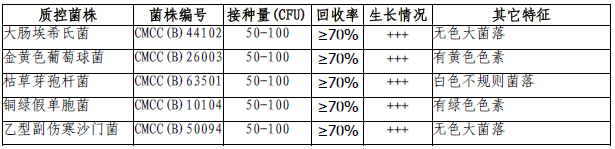 按标签用法制备培养基,接种以下质控菌株,放置30-35℃需氧培养18-24小时。 注:回收率计算时,用TSA琼脂做对照培养基。