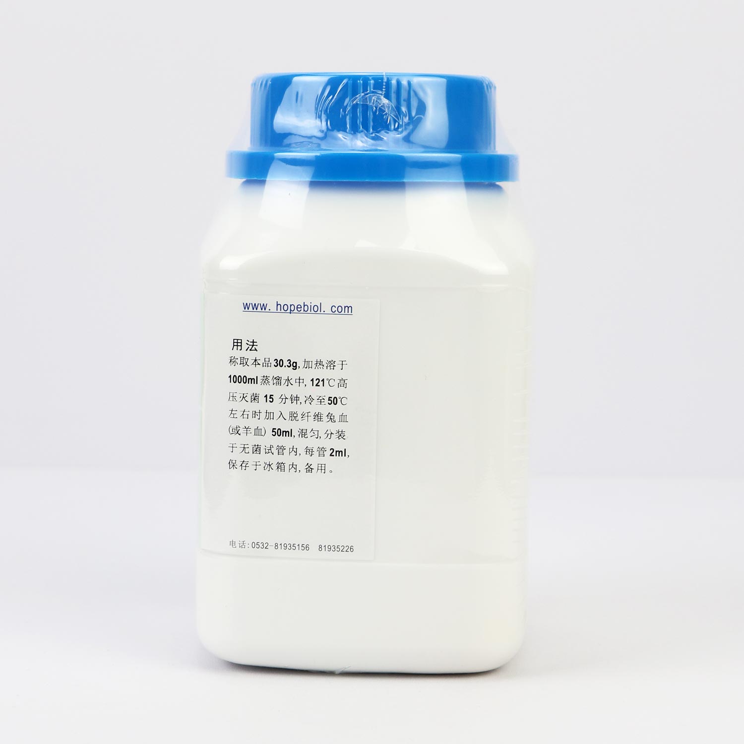 称取本品30.3g,加热溶于1000ml蒸馏水中,121℃高压灭菌15分钟,冷至50℃左右时加入脱纤维兔血(或羊血)50ml,混匀,分装于无菌试管内,每管2ml,保存于冰箱内,备用。