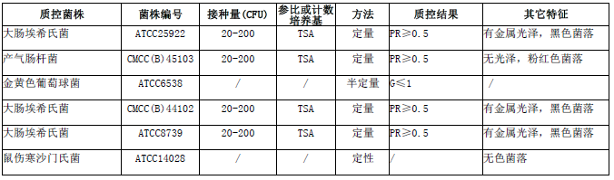 按标签用法制备培养基,接种以下质控菌株,放置36±1℃需氧培养18-24小时。