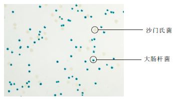大肠菌群典型菌落为蓝绿色,其它细菌为无色或黄色菌落。