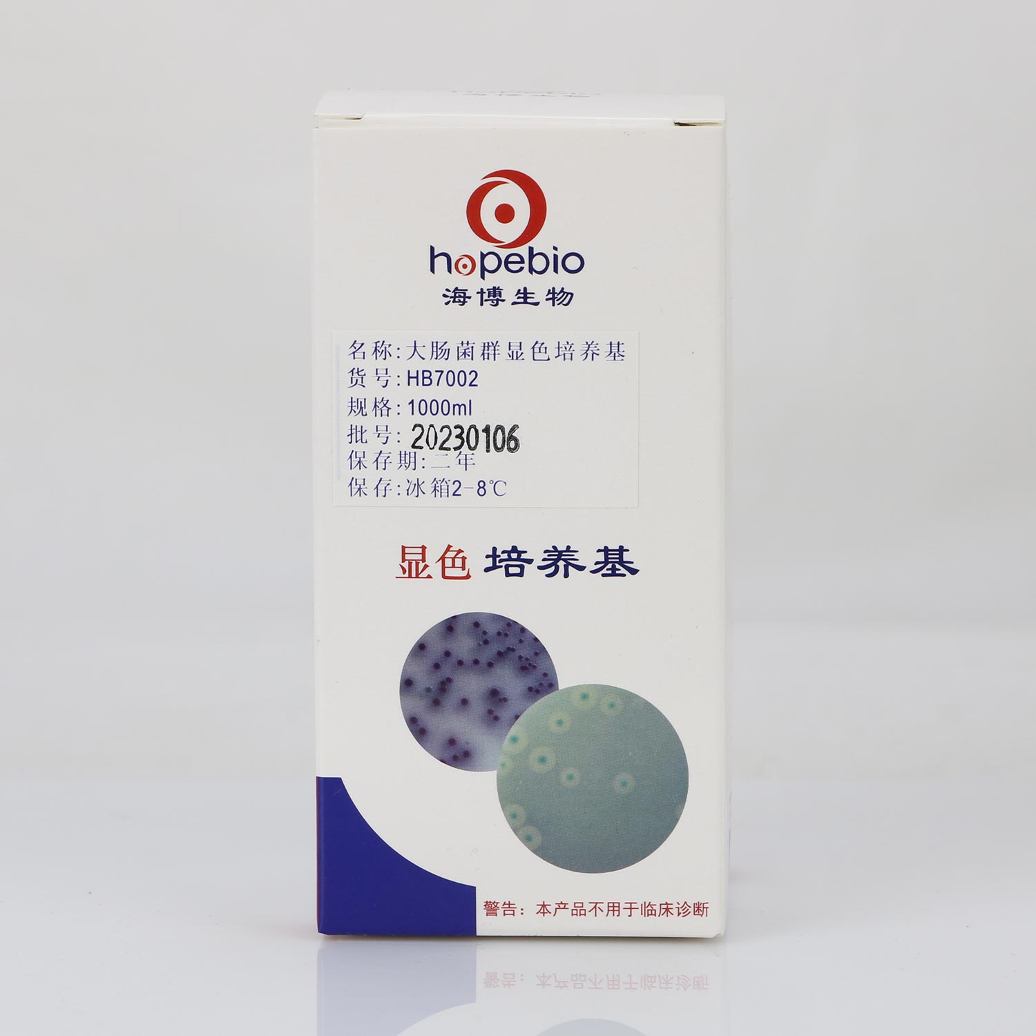 大肠菌群显色培养基是青岛海博生物公司改良的培养基,用于食品、水、牛奶、冰激凌和肉制品中大肠菌群的快速检测。大肠菌群显蓝绿色,其它菌显黄色或无色,革兰氏阳性菌被抑制。