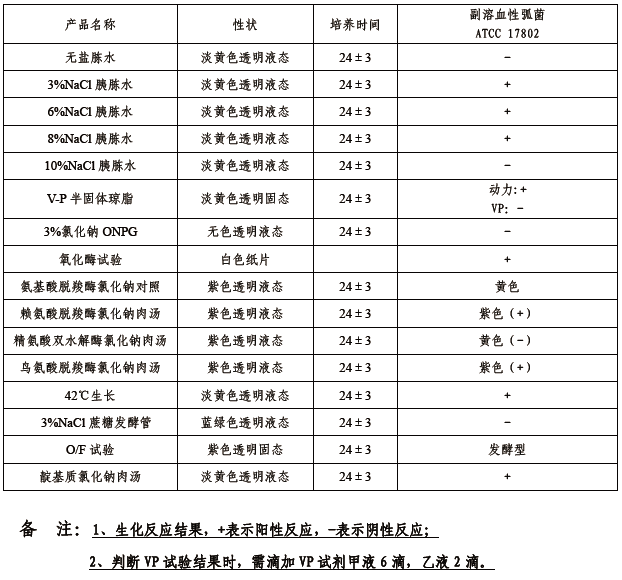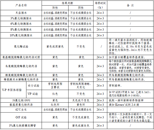从选择性琼脂平板(TCBS琼脂或副溶血性弧菌显色培养基)上至少选取2个典型菌落或可疑菌落,每个菌落分别接种到无盐胰胨水、3%氯化钠胰胨水、氯化钠三糖铁琼脂进行鉴别试验,本套成套生化管不含氯化钠三糖铁琼脂。其它的生化管是否进行接种,请参照SN0173标准判断结果。