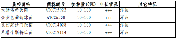 按标签用法制备培养基,接种以下质控菌株,放置36±1℃需氧培养18-24小时。