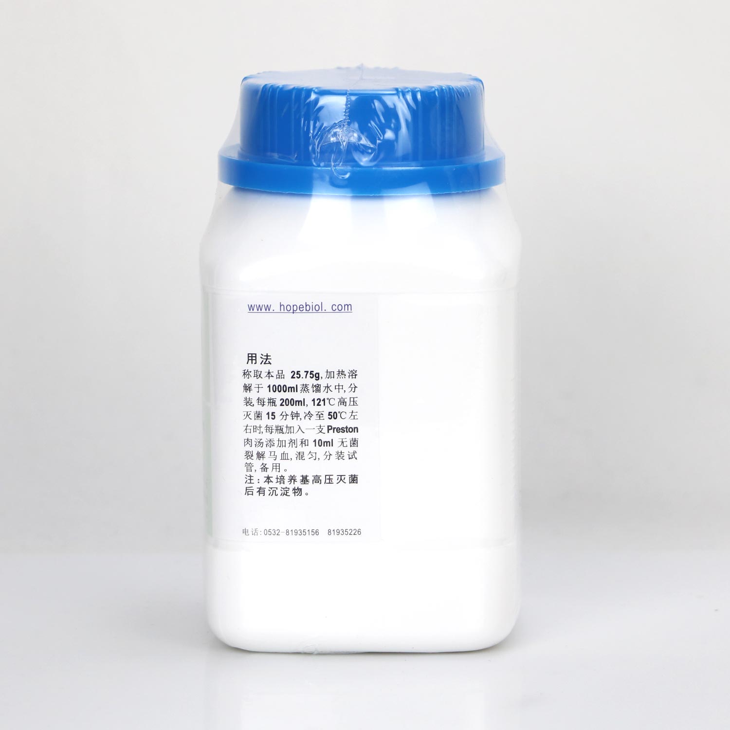 称取本品 25.75g,加热溶解于 1000ml 蒸馏水中,分装,每瓶 200ml,121℃高压灭菌 15 分钟,冷至 50℃左右时,每瓶加入一支 Preston肉汤添加剂和 10ml 无菌裂解马血,混匀,分装试管,备用。