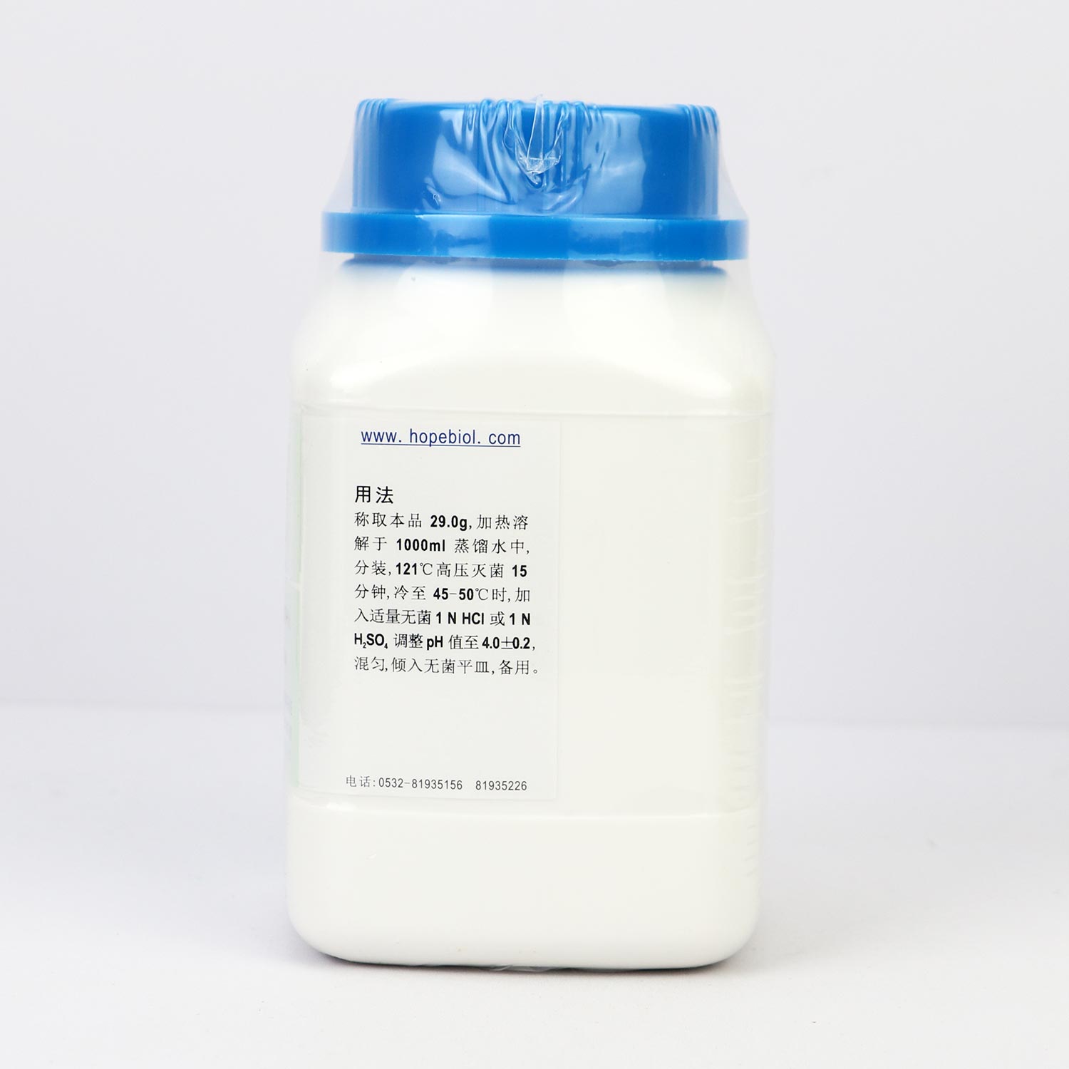称取本品 29.0g,加热溶解于 1000ml 蒸馏水中,分装,121℃高压灭菌 15分钟,冷至 45-50℃时,加入适量无菌 1 N Hcl 或 1 NH2SO4 调整 pH 值至 4.0±0.2,混匀,倾入无菌平皿,备用。