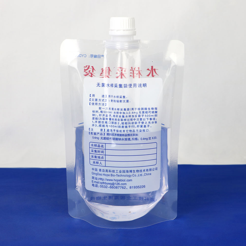 取一只无菌水样采集袋(用于检测微生物指标时,每500ml水样中加入0.4mg无菌硫代硫酸钠),拧开盖子,将所采集水样加至袋子500ml刻度线(为取样量标准在取样过程中注意以下事项:1、手捏住瓶口颈部。2、轻轻抖动袋子使之充分张开。3、视线与500ml刻度线平行。),拧紧盖子。
