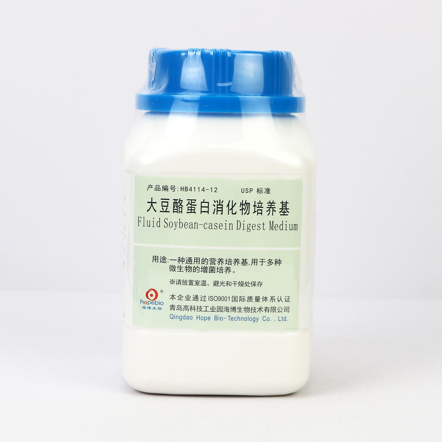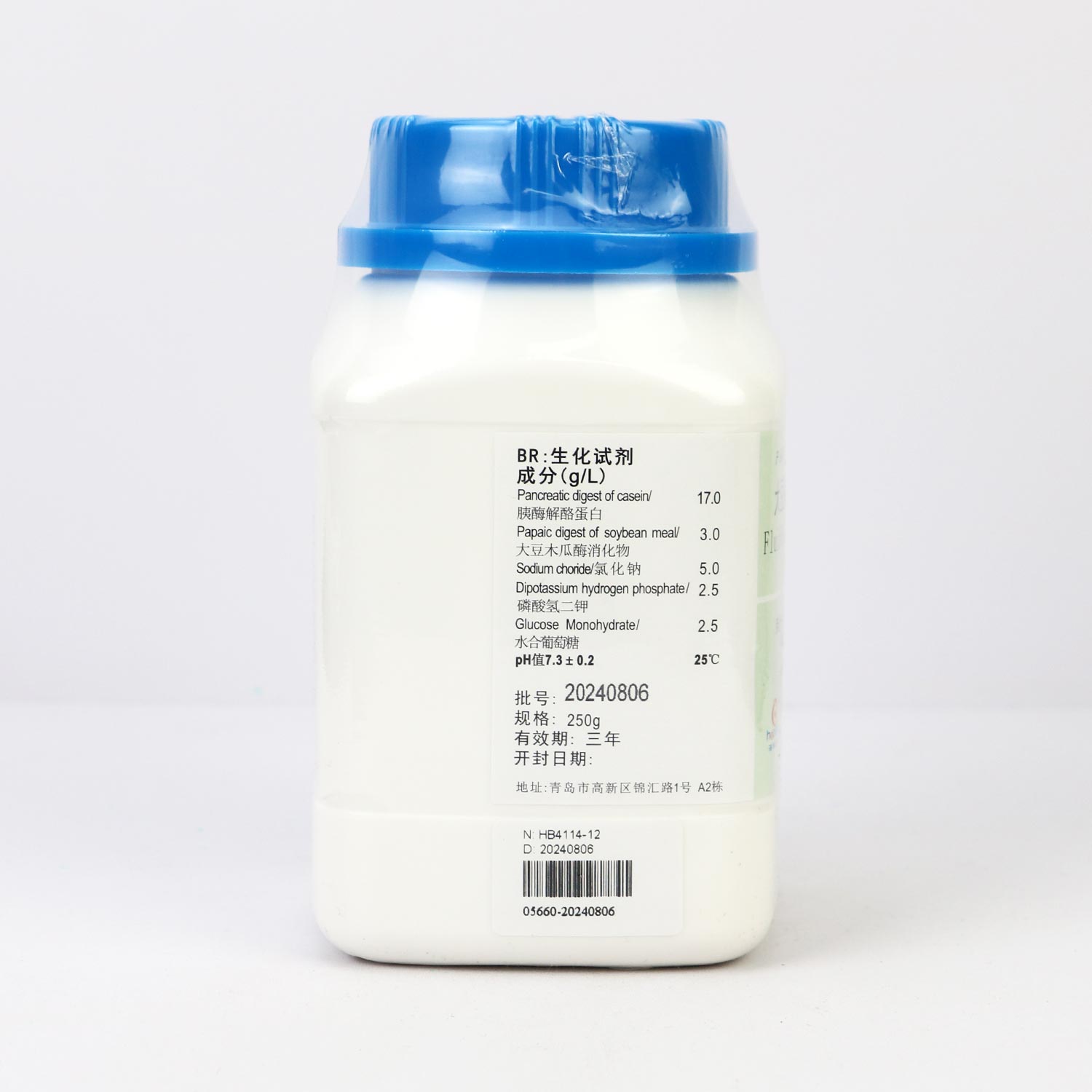 Pancreatic digest of casein/胰酶解酪蛋白 17.0 Papaic digest of soybean meal/大豆木瓜酶消化物 3.0 Sodium choride/ 氯化钠 5.0 Dipotassium hydrogen phosphate /磷酸氢二钾 2.5 Dextrose (C6H12O6 .H2O)/ 水合葡萄糖 2.5 pH值7.3 ± 0.2 25℃ 用法: