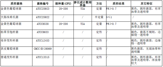 按标签用法制备培养基,接种以下质控菌株,放置36±1℃需氧培养45-48小时。