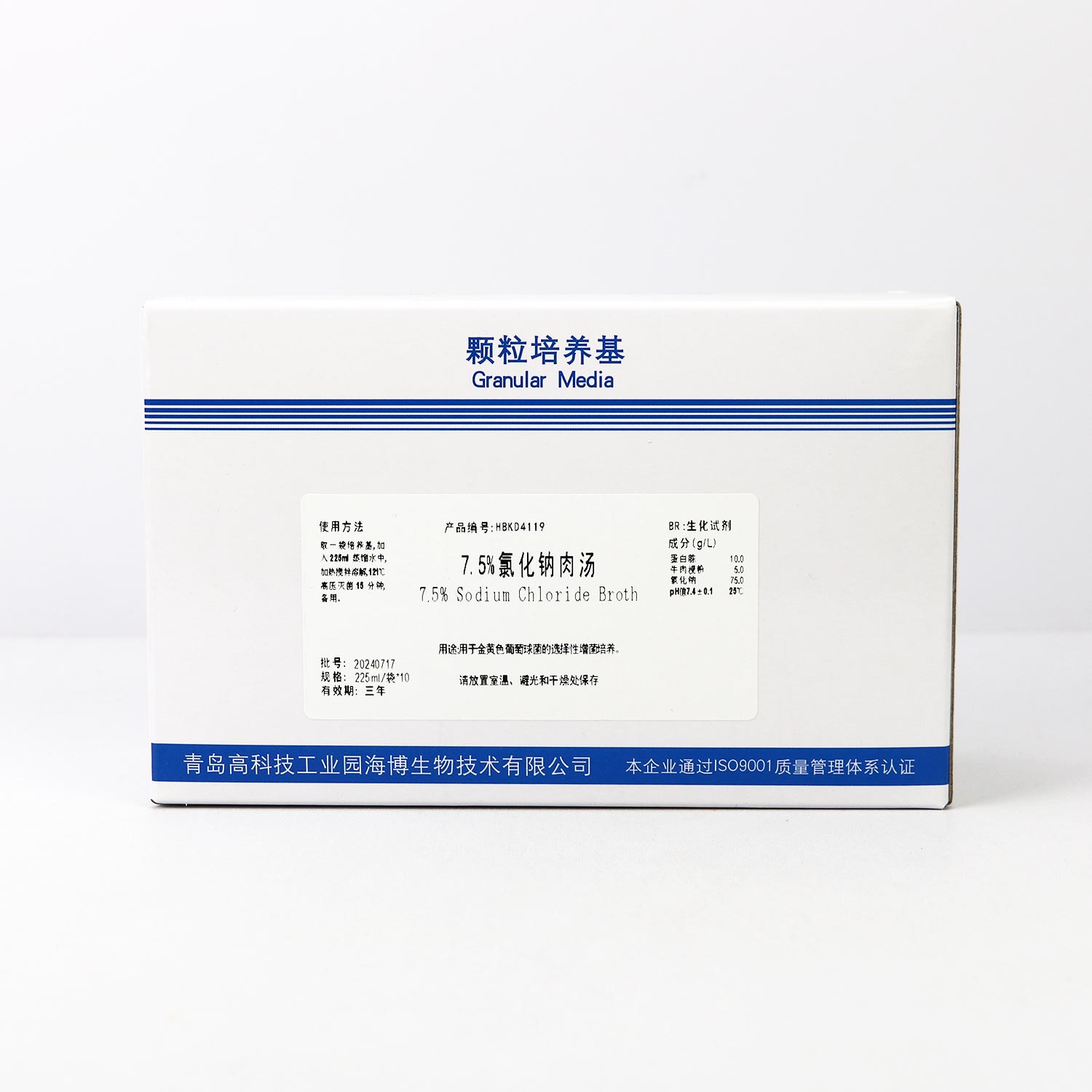 蛋白胨 10.0 牛肉浸粉 5.0 氯化钠 75.0 pH值7.4±0.1 25℃