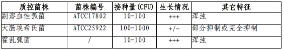 按标签用法制备培养基,接种以下质控菌株,放置37±1℃需氧培养18-24小时。