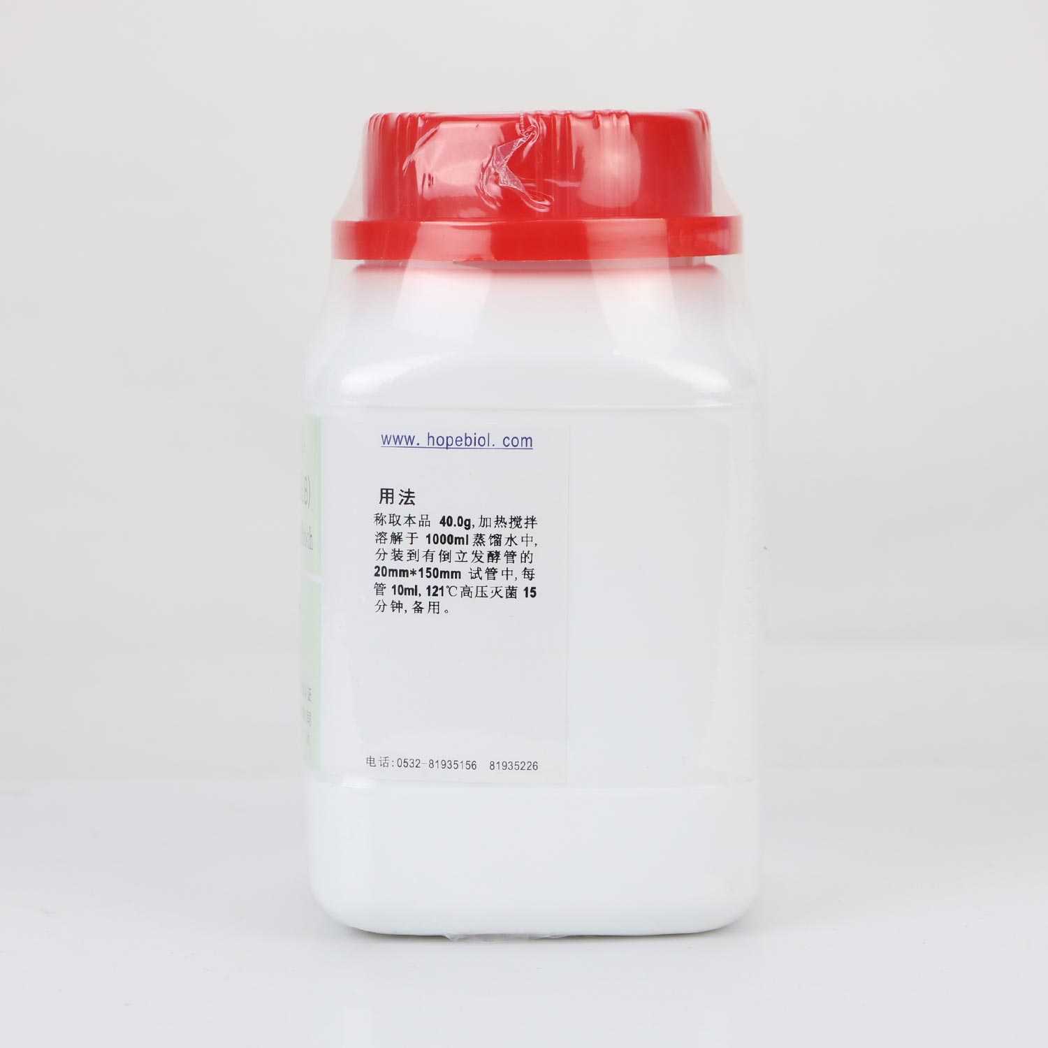 称取本品40.0g,加热搅拌溶解于 1000ml 蒸馏水中,分装到有倒立发酵管的20mm*150mm 试管中,每管 10ml,121℃高压灭菌 15 分钟,备用。