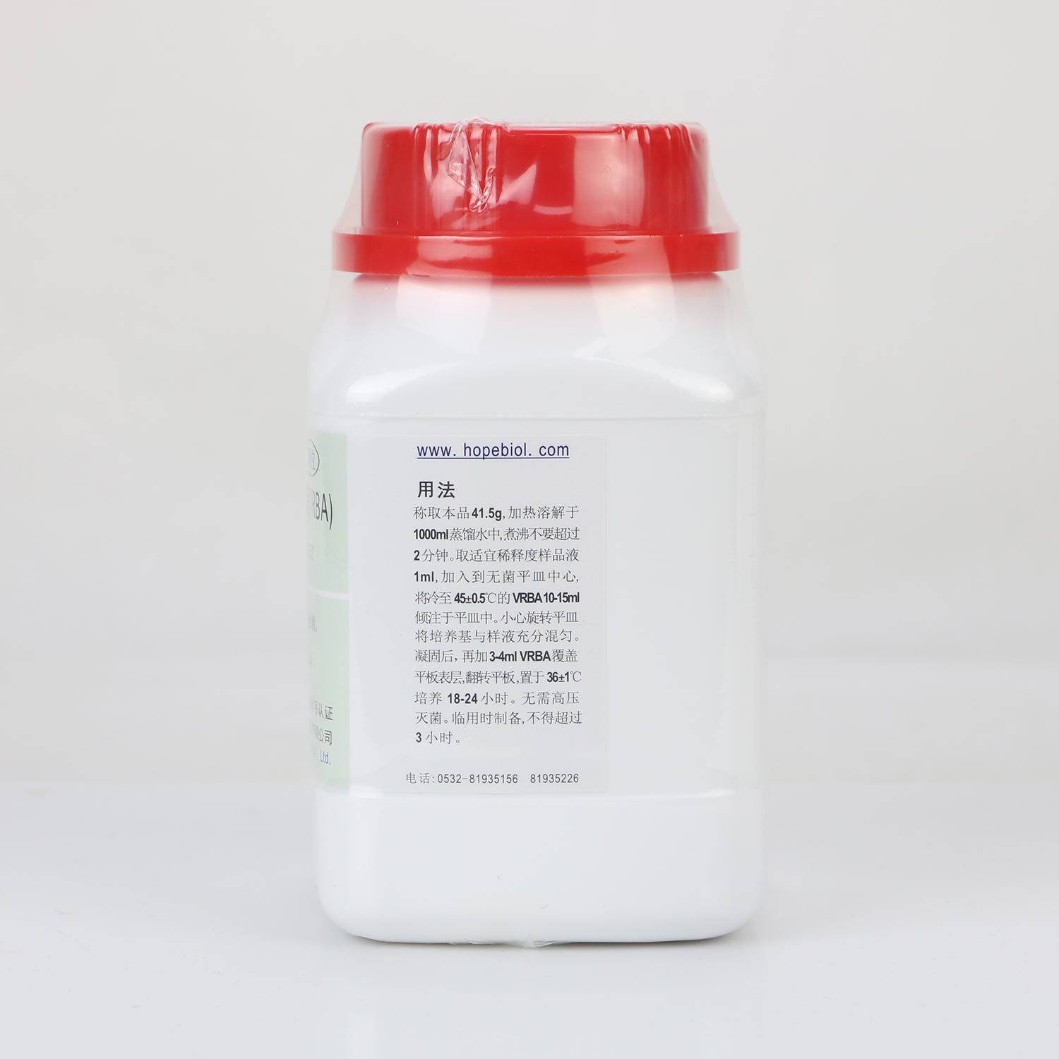 称取本品41.5g,加热溶解于1000ml蒸馏水中,煮沸不要超过2分钟。取适宜稀释度样品液1ml,加入到无菌平皿中心,将冷至45±0.5℃的VRBA 10-15ml倾注于平皿中。小心旋转平皿将培养基与样液充分混匀。凝固后,再加3-4ml VRBA覆盖平板表层 ,翻转平板 ,置于36±1℃培养18-24小时。无需高压灭菌。临用时制备,不得超过3小时。