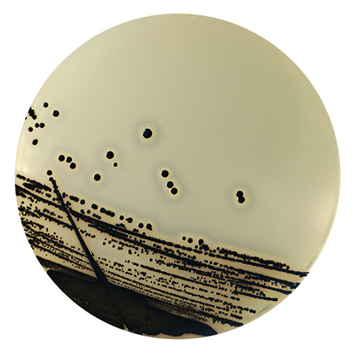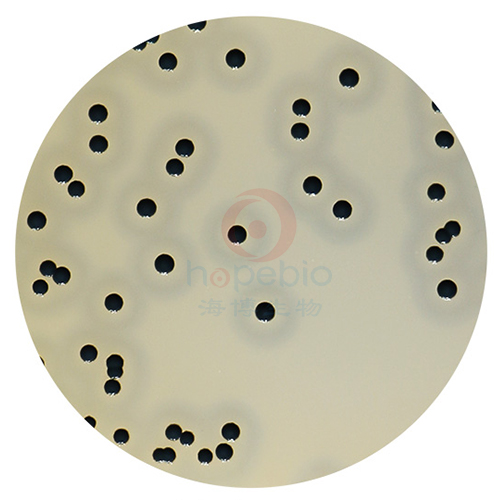 在 36±1℃培养 45-48h,金黄色葡萄球菌的单个菌落呈圆形,表面光滑、凸起、湿润,直径 2-3mm。灰黑色至黑色,有光泽,常有浅色(非白色)的边缘,周围绕以不透明圈(沉淀),其外常有一清晰带。