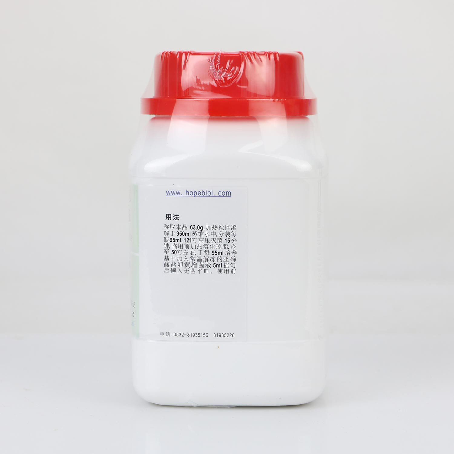 称取本品 63.0g,加热搅拌溶解于 950ml 蒸馏水中,分装每瓶 95ml,121℃高压灭菌 15 分钟,临用前加热溶化琼脂,冷至 50℃左右,于每 95ml 培养基中加入常温解冻的卵黄亚碲酸钾增菌剂 5ml 摇匀后倾入无菌平皿。
