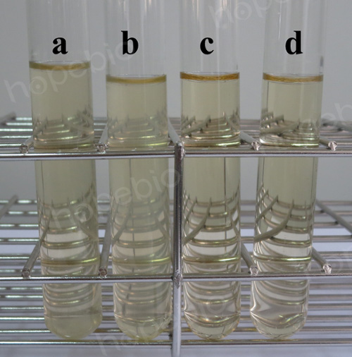 a:金黄色葡萄球菌(ATCC25923),b:金黄色葡萄球菌(ATCC6538),c:大肠埃希氏菌,d:空白