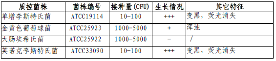 按标签用法制备培养基,接种以下质控菌株,放置30℃需氧培养25±1小时。