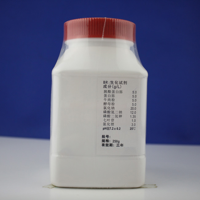 胰酪蛋白胨 5.0 蛋白胨 5.0 牛肉粉 5.0 酵母粉 5.0 氯化钠 20.0 磷酸氢二钠 12.0 磷酸二氢钾 1.35 七叶苷 1.0 氯化锂 3.0 pH值7.2±0.2 25℃