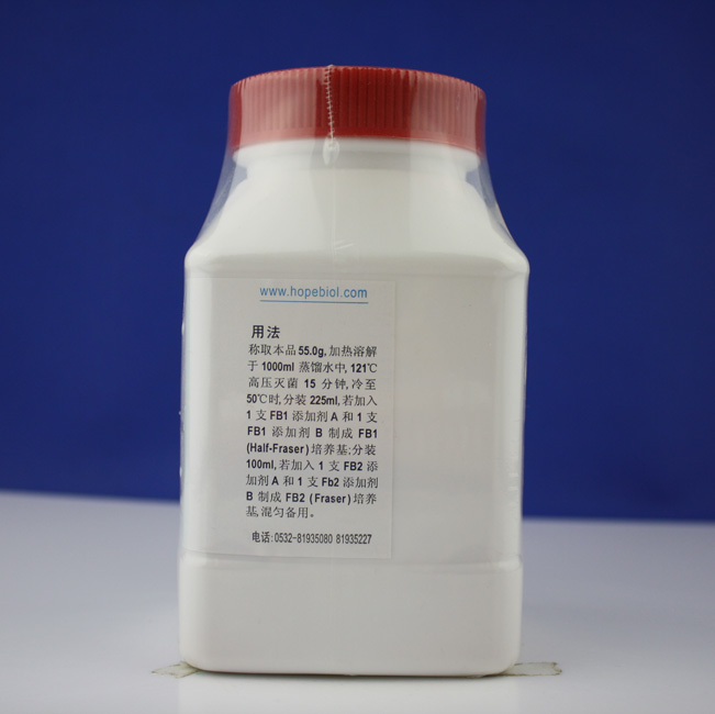 称取本品 55.0g,加热溶解于 1000ml 蒸馏水中,121℃高压灭菌 15 分钟,冷至50℃时,分装 225ml,若加入1 支 FB1 添加剂 A 和 1 支FB1 添加剂 B 制成 FB1(Half-Fraser ) 培养基;分装100ml,若加入 1 支 FB2 添加剂 A 和 1 支 Fb2 添加剂B 制成 FB2 ( Fraser ) 培养基,混匀,备用。