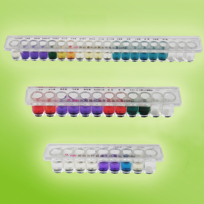 用于副溶血性弧菌的生化鉴定,每条包括:无盐胨水、7%氯化钠胰胨水、10%氯化钠胰胨水、3%氯化钠VP半固体培养基、3%氯化钠甘露醇、3%氯化钠赖氨酸脱羧酶、3%氯化钠氨基酸脱羧酶对照、氧化酶试纸1包、ONPG(副弧专用)共9种生化反应。(GB标准) (需购买Kovacs靛基质试剂盒配套使用)