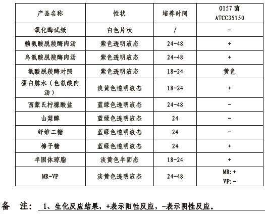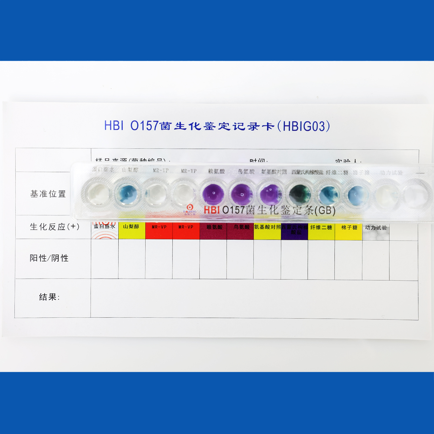 用于大肠杆菌0157:H7/NM生化鉴定,每条包括:山梨醇、色氨酸肉汤(蛋白胨水)、MR-VP( 2孔)、氧化酶试纸、西蒙氏枸椽酸盐、鸟氨酸、赖氨酸、氨基酸脱羧酶对照、纤维二糖、棉子糖、动力试验共12生化反应。(GB标准)