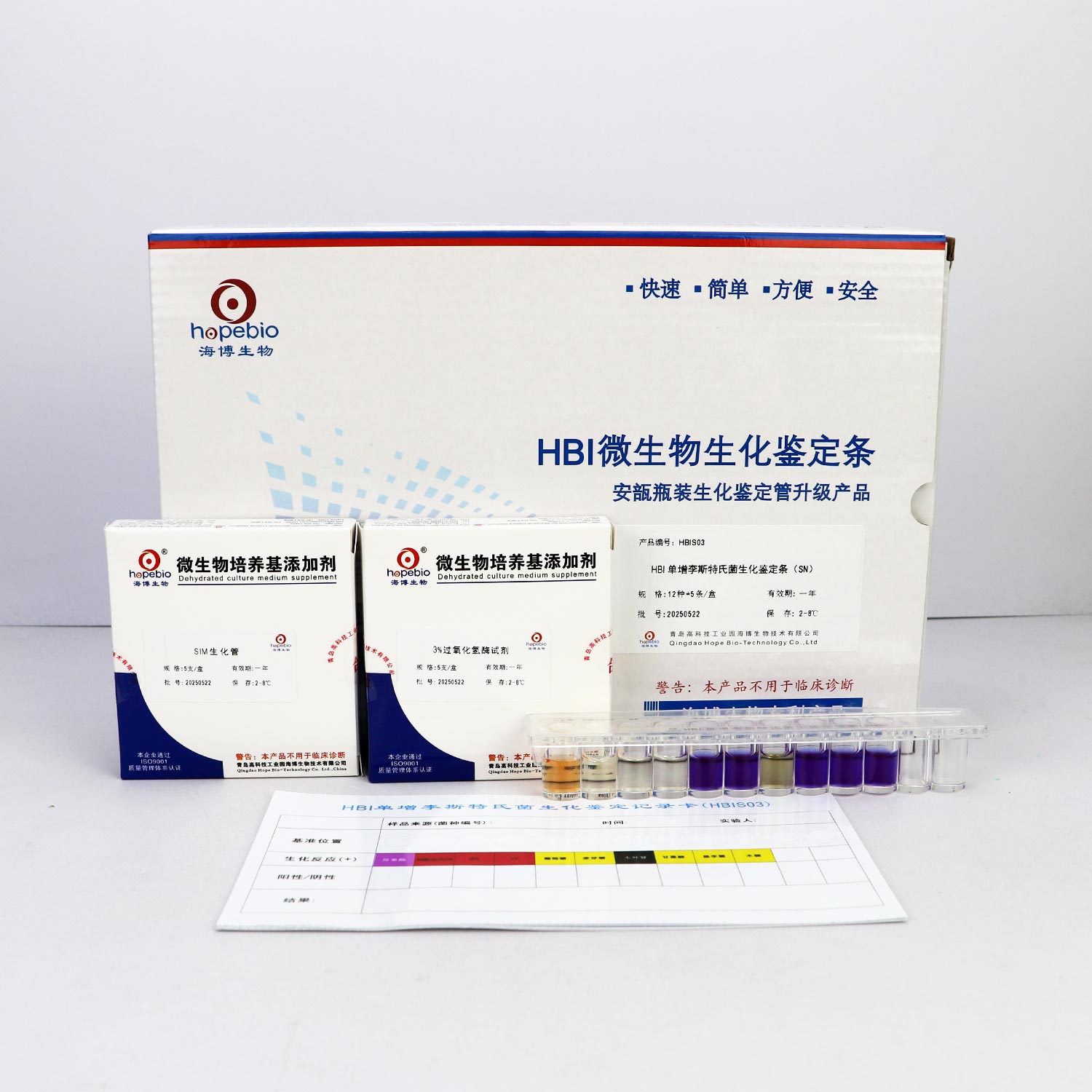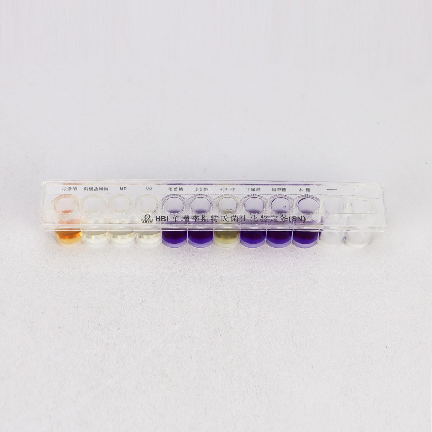 用于单增李斯特氏菌的生化鉴定。组成:木糖、鼠李糖、SIM生化管、3%过氧化氢酶试剂、硝酸盐肉汤、葡萄糖、麦芽糖、甘露醇、七叶苷、MR-VP(2孔)、尿素酶(水剂),共12种生化反应。(SN标准)