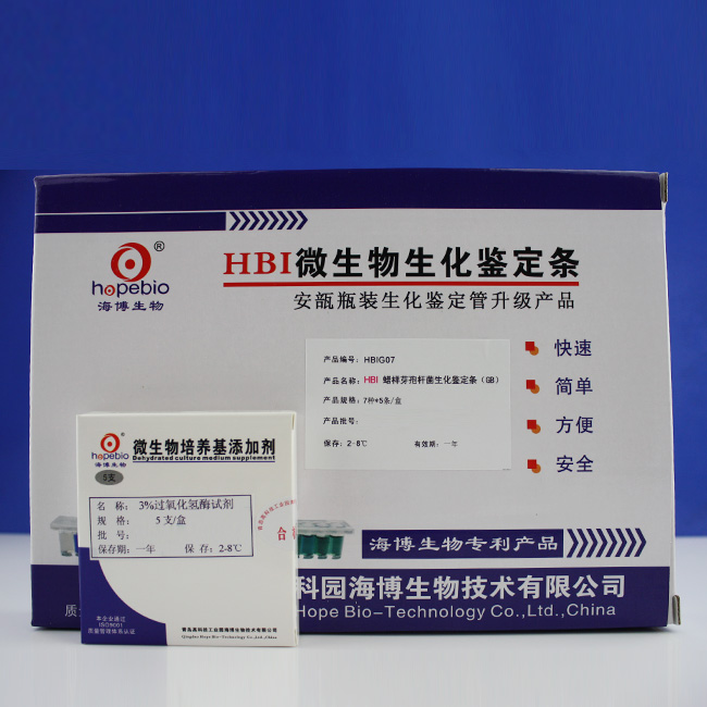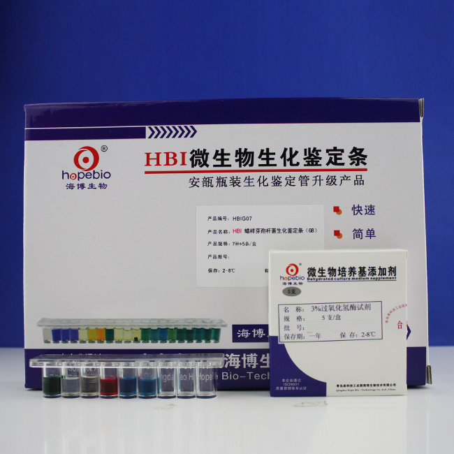 用于蜡样芽孢杆菌的生化鉴定,组成:3%过氧化氢酶试剂、西蒙氏枸椽酸盐、动力-硝酸盐培养基、VP试验、木糖-明胶、甘露醇、葡萄糖,共7种生化反应。(GB)(需甲基红试剂盒、V-P试剂盒、硝酸盐还原试剂盒配套使用)