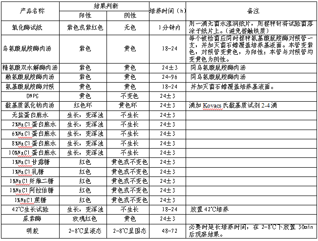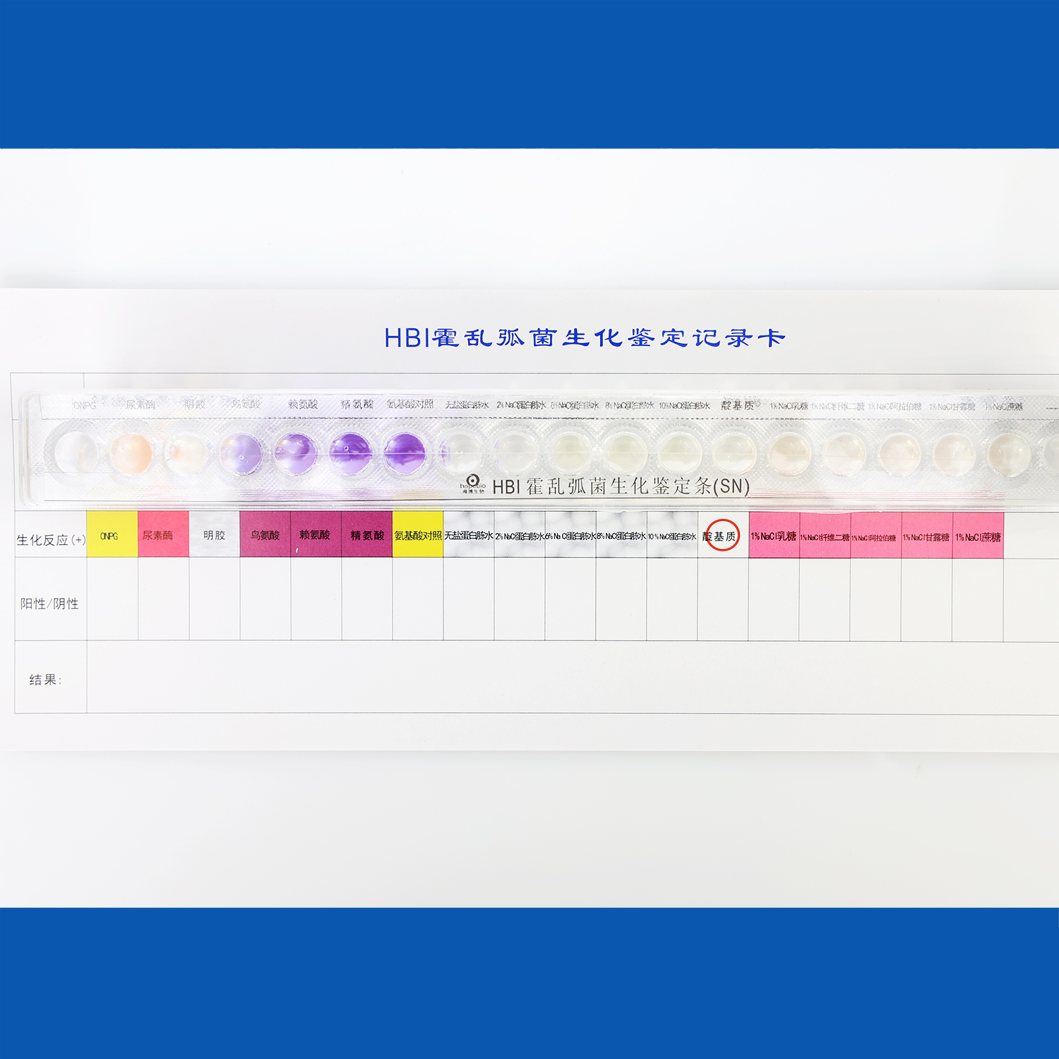 从选择性琼脂平板(TCBS琼脂或弧菌显色培养基)上至少选取5个典型菌落或可疑菌落,在氯化钠营养琼脂纯化培养,在显微镜下检验(革兰氏染色试验和动力试验)后分别接种到氯化钠三糖铁琼脂,并进行氧化酶试验。本生化鉴定条不含氯化钠三糖铁琼脂。其它的生化管是否进行接种,请参照SN/T1022标准。