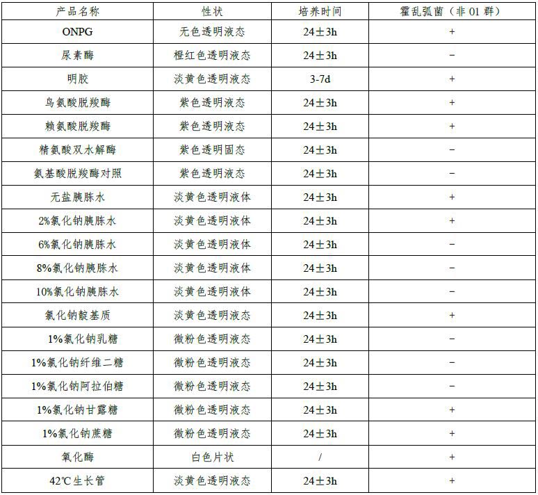 用于霍乱弧菌的生化鉴定。组成:MR-VP、ONPG、尿素酶、明胶、精氨酸双水解酶肉汤、鸟氨酸脱羧酶肉汤、赖氨酸脱羧酶肉汤、氨基酸脱羧酶对照、无盐胰胨水、3%氯化钠胰胨水、6%氯化钠胰胨水、8%氯化钠胰胨水、10%氯化钠胰胨水、1%氯化钠甘露醇、1%氯化钠乳糖、1%氯化钠纤维二糖、1%氯化钠阿拉伯糖、1%氯化钠蔗糖、1%氯化钠甘露糖、42℃生长试验,共20种生化反应。(SN标准)