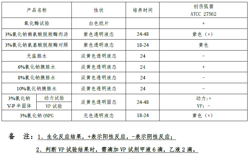 用于创伤弧菌的生化鉴定,每条组成:无盐胰胨水,6%氯化钠胰胨水,8%氯化钠胰胨水,10%氯化钠胰胨水,3%氯化钠VP半固体培养基,3%氯化钠赖氨酸脱羧酶,3%氯化钠氨基酸脱羧酶对照,3%氯化钠ONPG,氧化酶试纸1包,共9种生化反应。(GB标准)