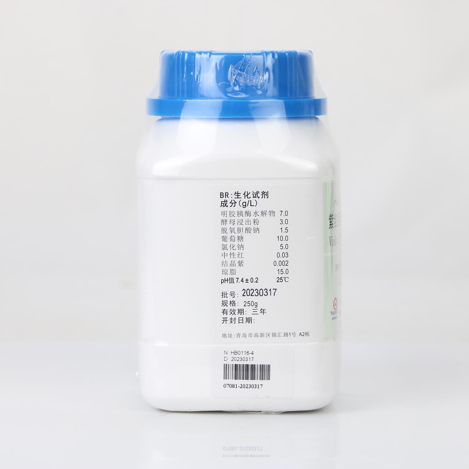 明胶胰酶水解物 7.0 酵母浸出粉 3.0 脱氧胆酸钠 1.5 葡萄糖 10.0 氯化钠 5.0 中性红 0.03 结晶紫 0.002 琼脂 15.0 pH值7.4±0.2 25℃